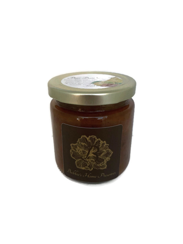 Ingredients: Pears, dates, garlic, cider vinegar, ginger,, brown sugar, cinnamon, nutmeg, cayenne pepper, salt.