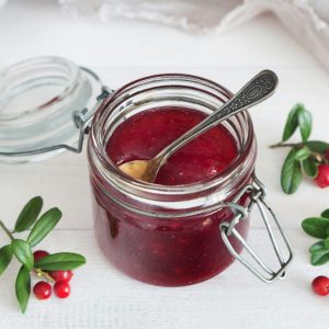 Ingredients: Strawberries, Cranberries, sugar, cinnamon, ginger, allspice, cloves, pectin.